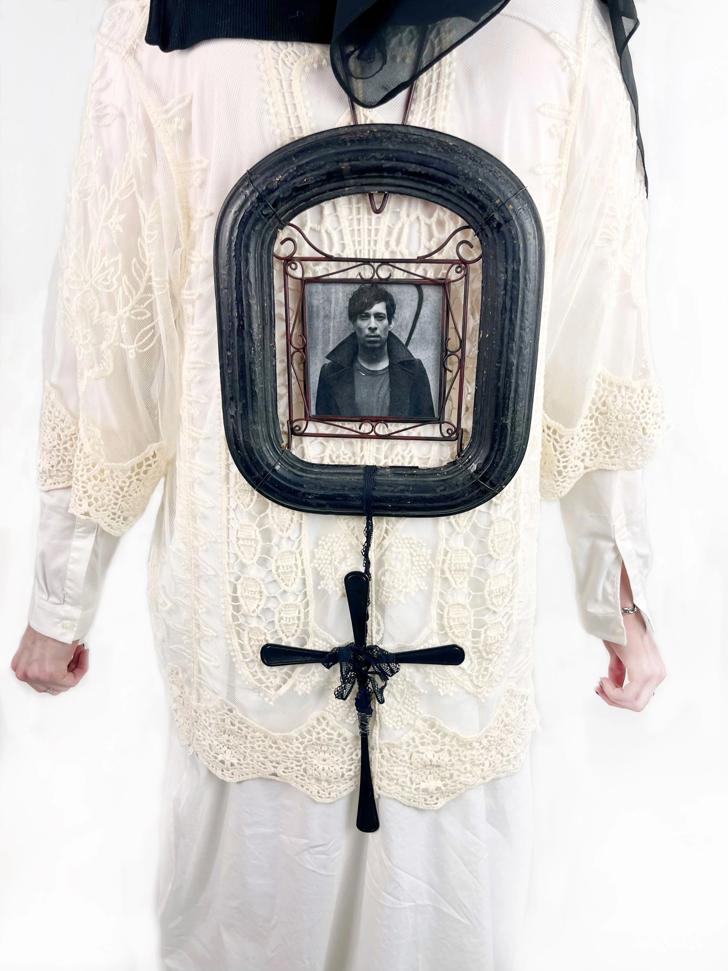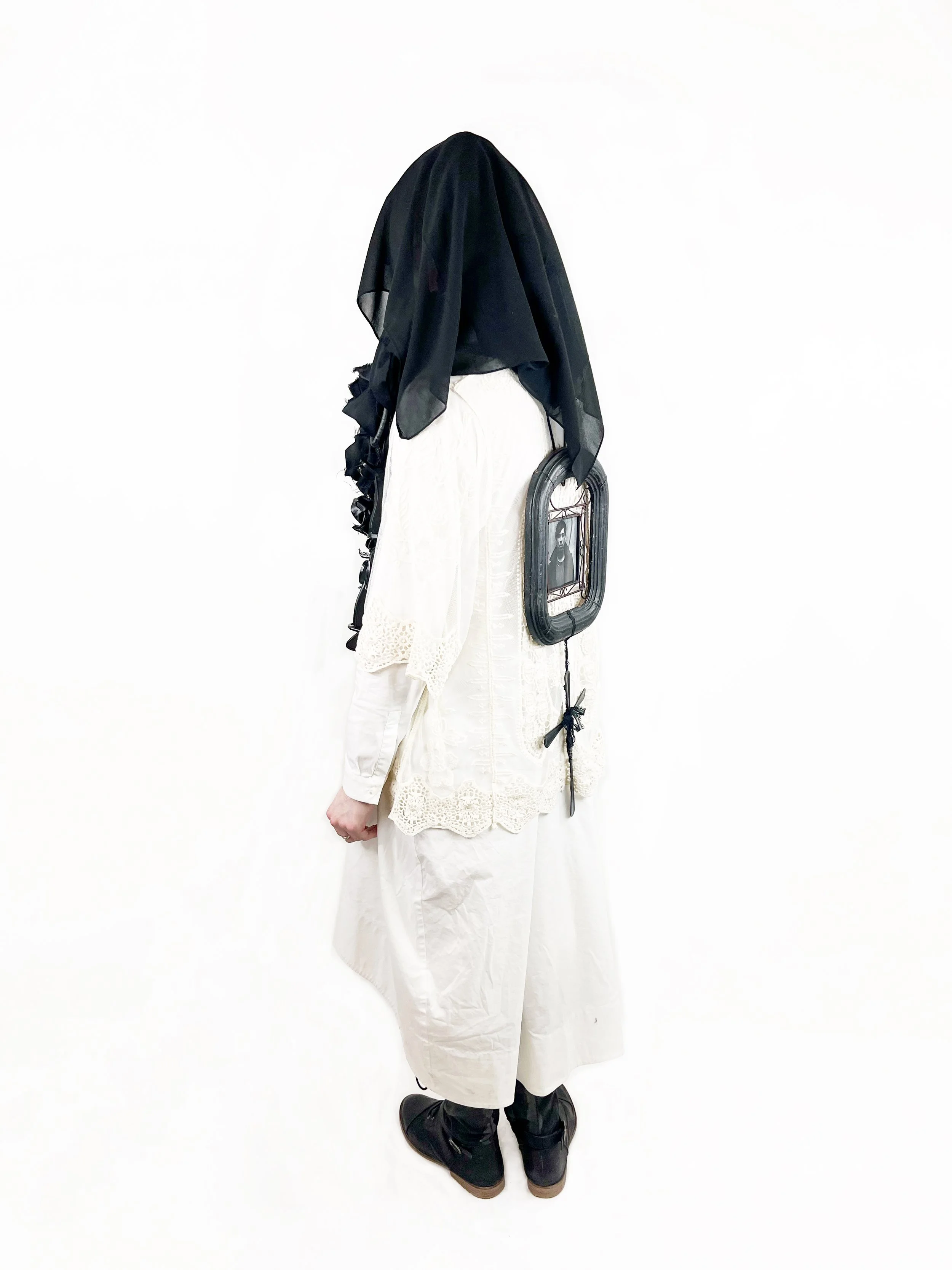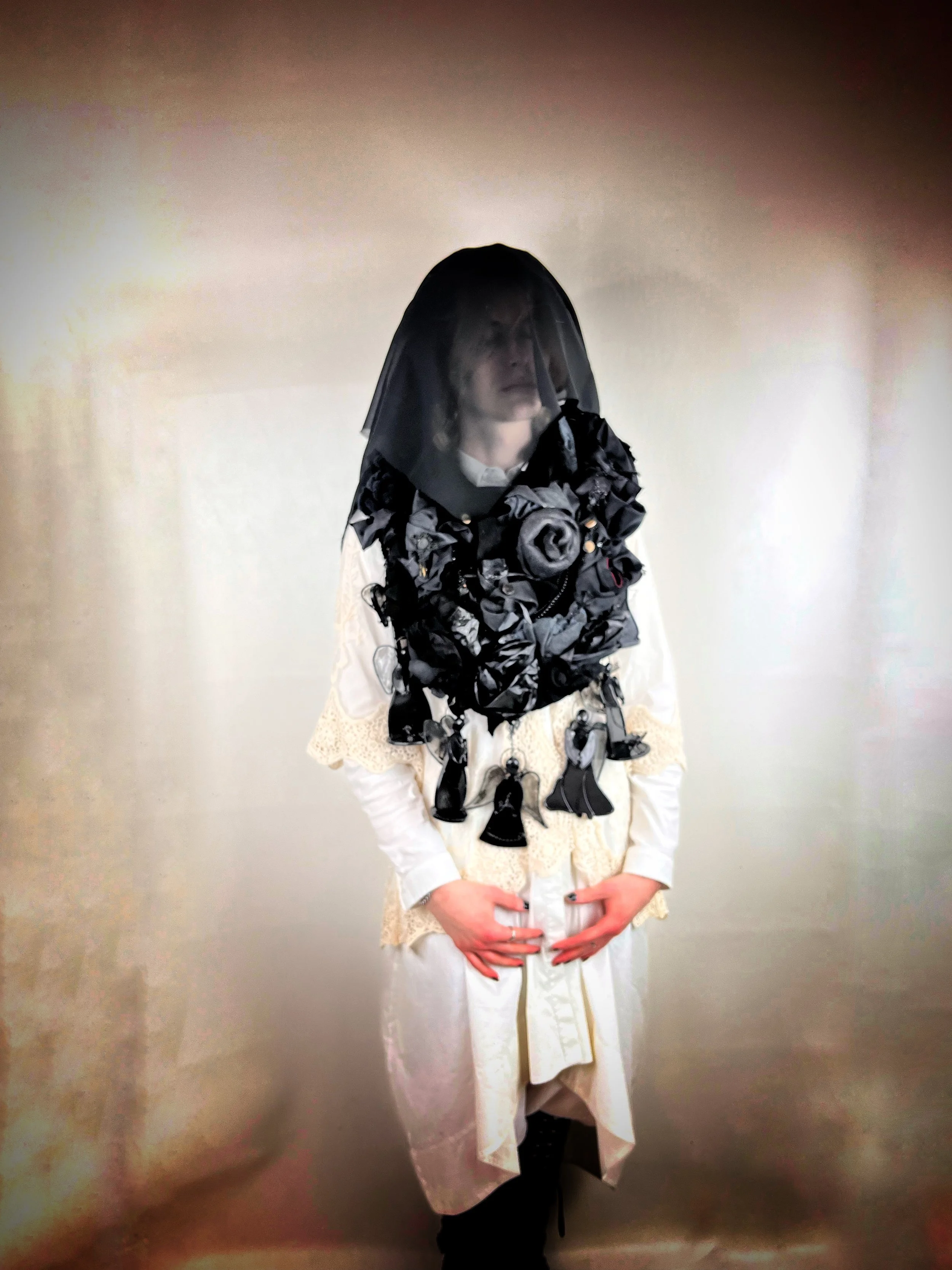 Drawing inspiration from Victorian era funerary adornments, this work attempts to bring the practice to modern times. Historically, work in the field has often utilized drab colors and users consistently wear these garments to emphasize the period of mourning one would be in after a loved one had passed.