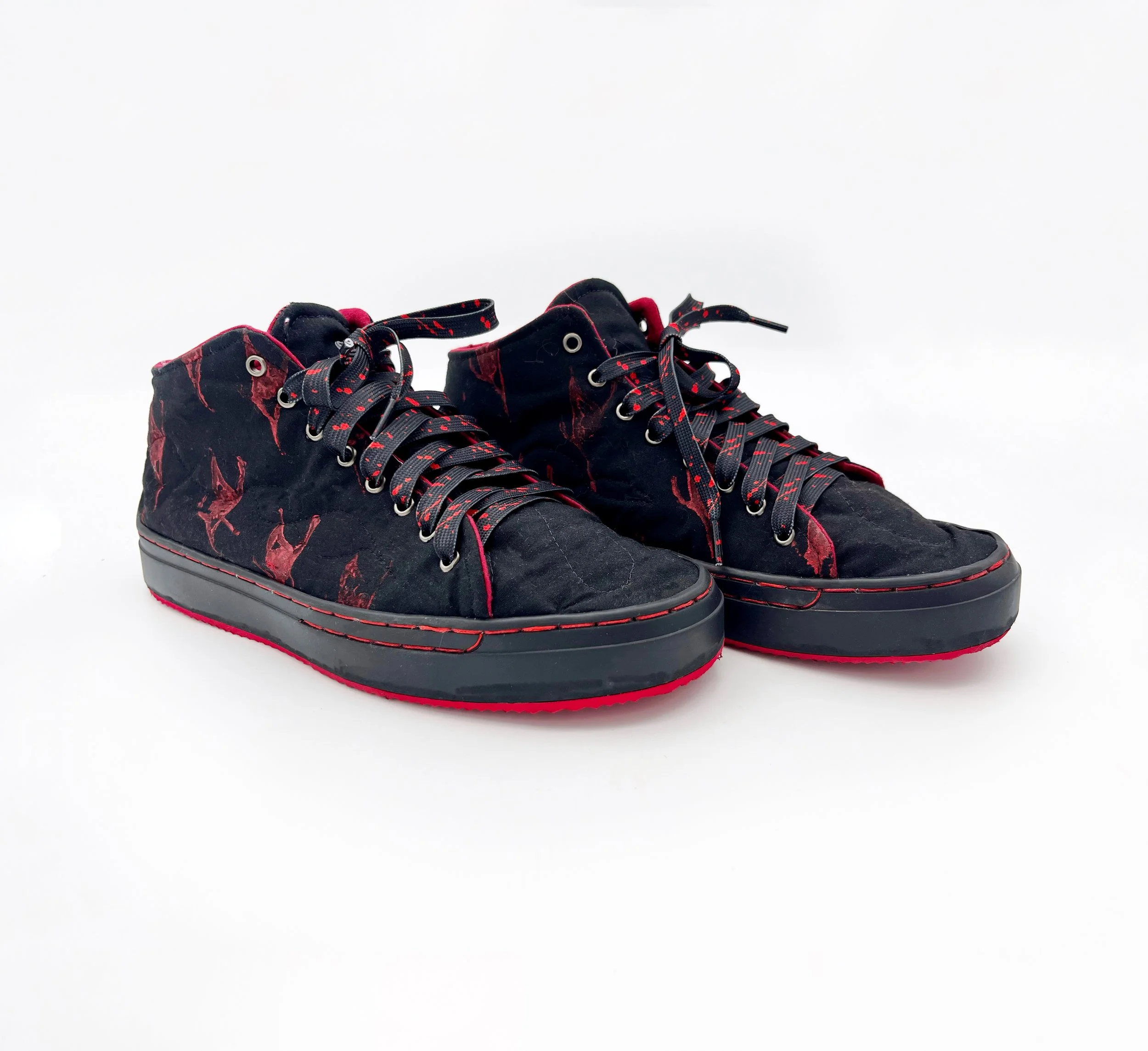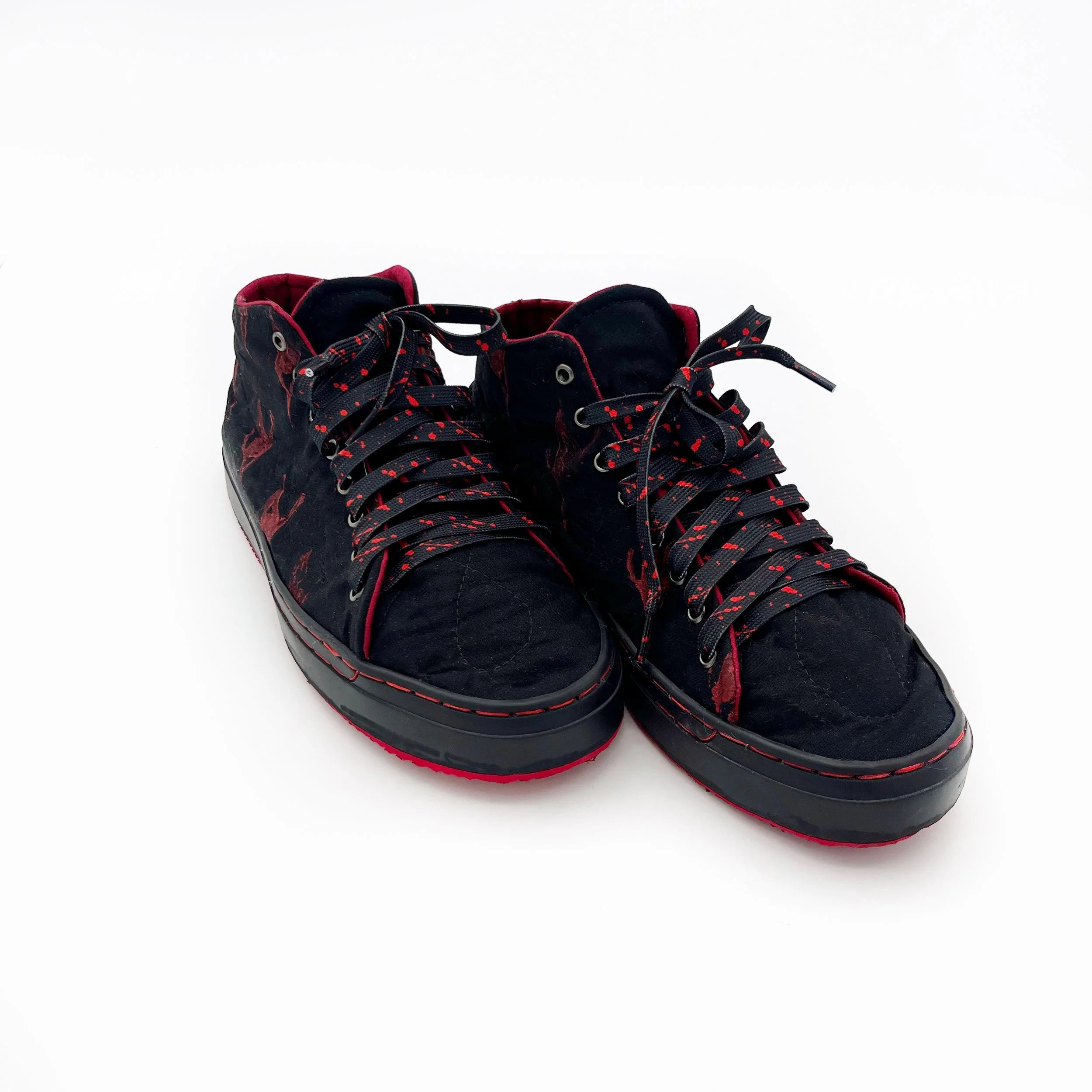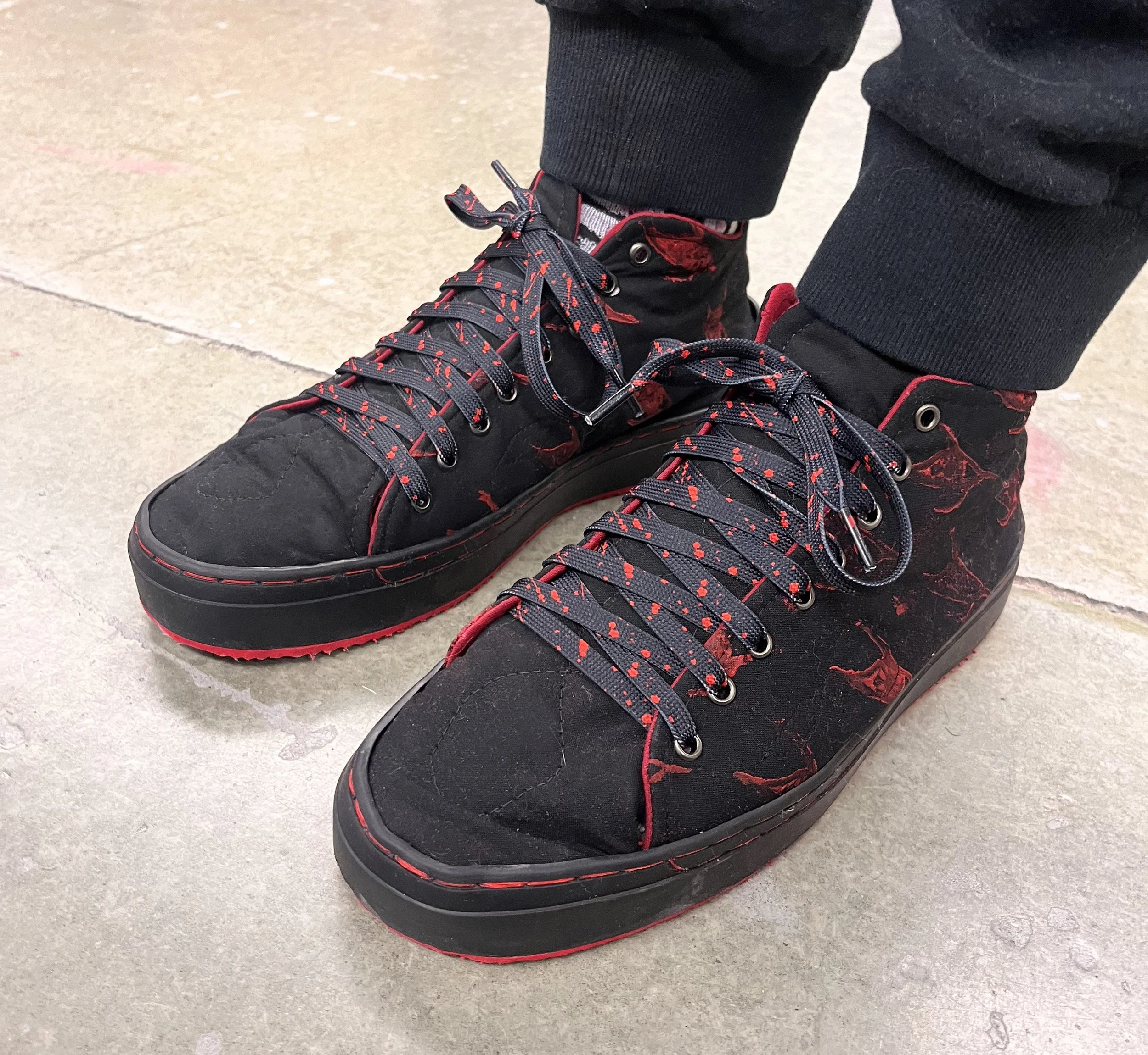 Starting from two black soles and a fabric pattern, these sneakers slowly began to take shape as cut duck cloth sheets were ironed with batting and lining, then carefully sewn together to form the complete upper portion of the shoe. Holes were punched out and grommets were added.